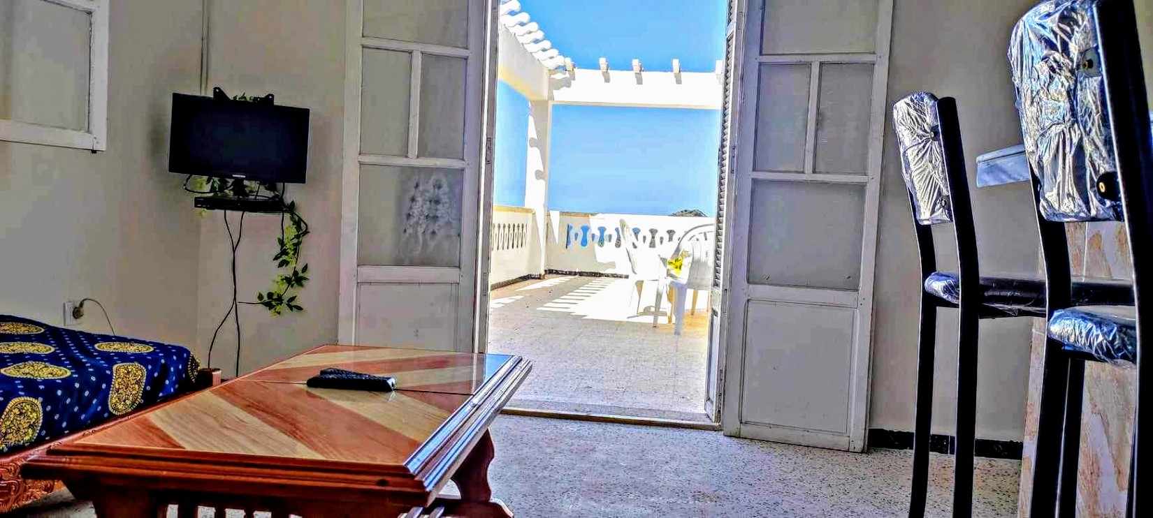 Cet appartement est situé au 4ème étage de la résidence. Dans ce charmant appartement, il y a un coin salon ouvert sur la cuisine. La chambre dispose de 2 lits (un lit double et un lit simple) et de la climatisation, d'une salle de bain avec une eau chaude et froide en permanence, ainsi que d'une terrasse magnifique offrant une vue panoramique sur la mer et les montagnes. Il n'y a pas de vis-à-vis. Vous serez dans un cadre agréable, plaisant et convivial.